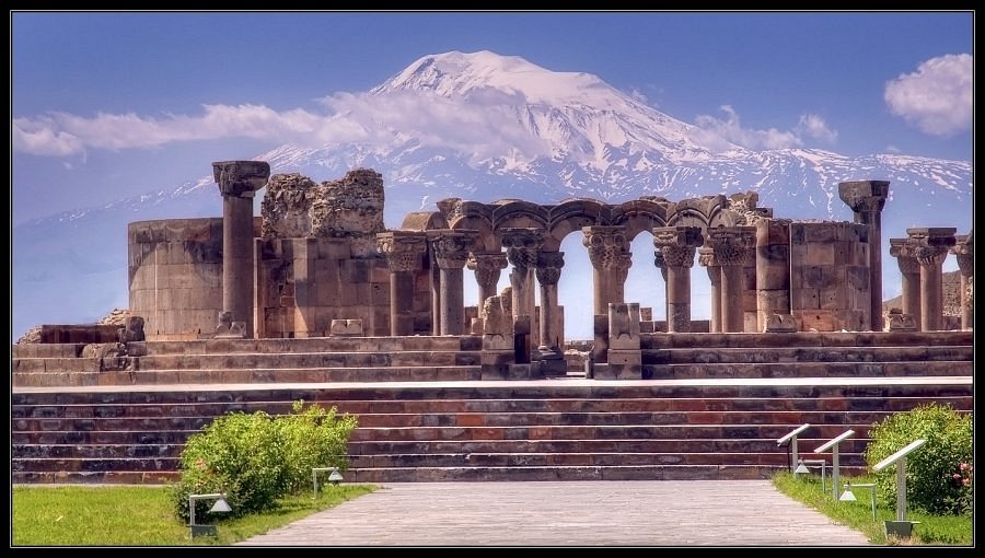 Ruins of the Zvartnos temple in Yerevan, Armenia, with Mt Ararat in the background.